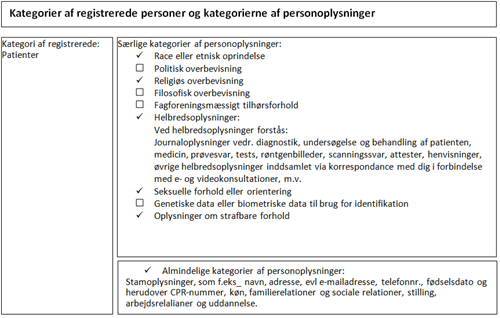 - Til brug for den almindelige patientbehandling indsamles og behandles almindelige personoplysninger i medfør af databeskyttelsesforordningens artikel 6(1)(c) og (d), mens de særlige kategorier af personoplysninger indsamles og behandles i medfør af databeskyttelsesforordningens artikel 9(2)(b), (c) og (h)